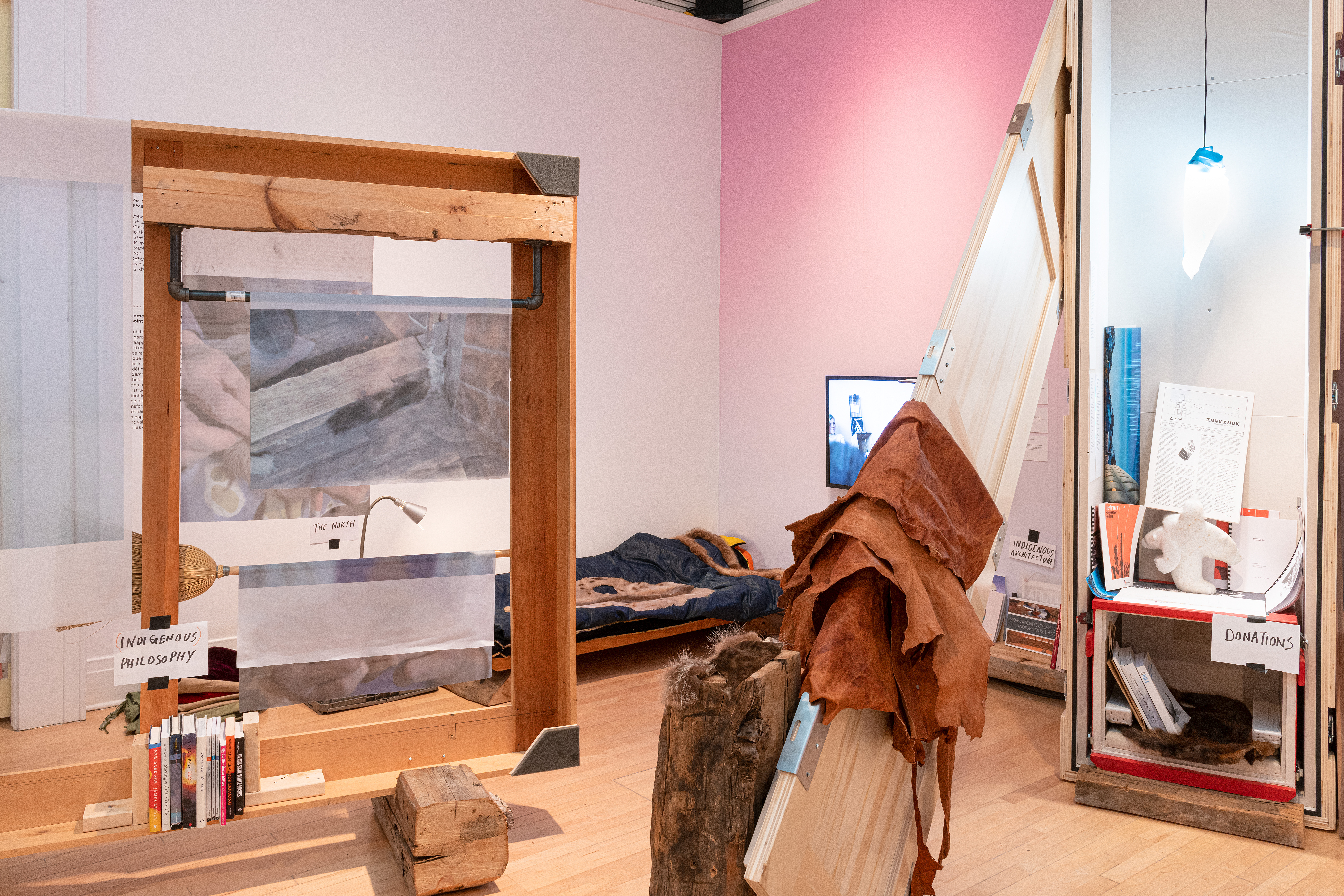 The last room was Sámi architect Joar Nango’s Girjegumpi (Sámi Architecture Library)(2018–), a portmanteau of the Sámi words for “book” and “mobile cabin.” The piece was first shown in 2018 at the Arctic Arts Festival and has seen many iterations since. This version of Girjegumpi was an arrangement of books, screens, lamps, coolers, furs, benches, fabrics, headphones, drawings, and much more, all displayed on the wooden crates they were shipped in. There was a mad discursive enthusiasm about the room. In the same way Inutiq’s auntie may have just wandered out for a smoke, the studious denizens of Girjegumpi may return at any moment and hold forth on the space’s many books and video lectures. The piece was also awash in audio from Inutiq’s Northern Virtual Broadcasting Channel One and Williamson Bathory’s recorded conversation—these sounds pooled into Nango’s library, hinting at lively conversation.