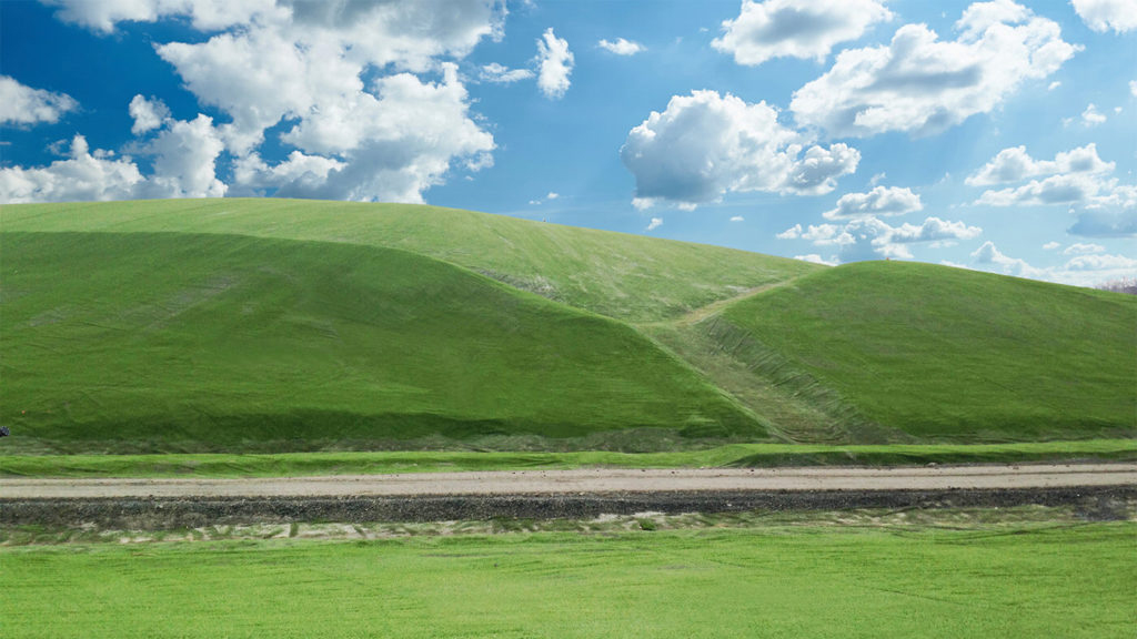 Underneath the plastic lining, the slow, cumbersome process of decomposition takes place. As landfills are literally wrapped in plastic—hermetically sealed—it is difficult to predict when a site will release its last breath of methane. As a matter of fact, Belvedere was predicted to have stopped belching already. It hasn’t. And so, Bodemzorg keeps waiting and safely burning off the greenhouse gas in a small adjacent facility. “Aftercare” is the telling term for these maintenance and monitoring activities.81 Unsurprisingly, aftercare is rather costly. This may explain why solar parks are built above active sites to supply the energy grid and regain value from what is essentially lost ground.82 Overseas in the US, the extensive cost of aftercare has led the waste industry to contemplate other technological interventions. A product called ClosureTurf® caught my attention. Manufactured in Austria and distributed by a Dutch company, the product promises to simultaneously replace animal grazing and manage erosion cheaply. It is an artificial grass carpet—made from plastics—at scale, no grazing required. Placed atop the landfill, the plastic grass is designed to blend visually into at least two types of landscapes; it is available in a green reminiscent of a Windows 95 screen display, or brown to emulate supposedly drier environments.83 The product’s advertising evokes the pastoral, if one ignores the black pipes still sticking out of it.
