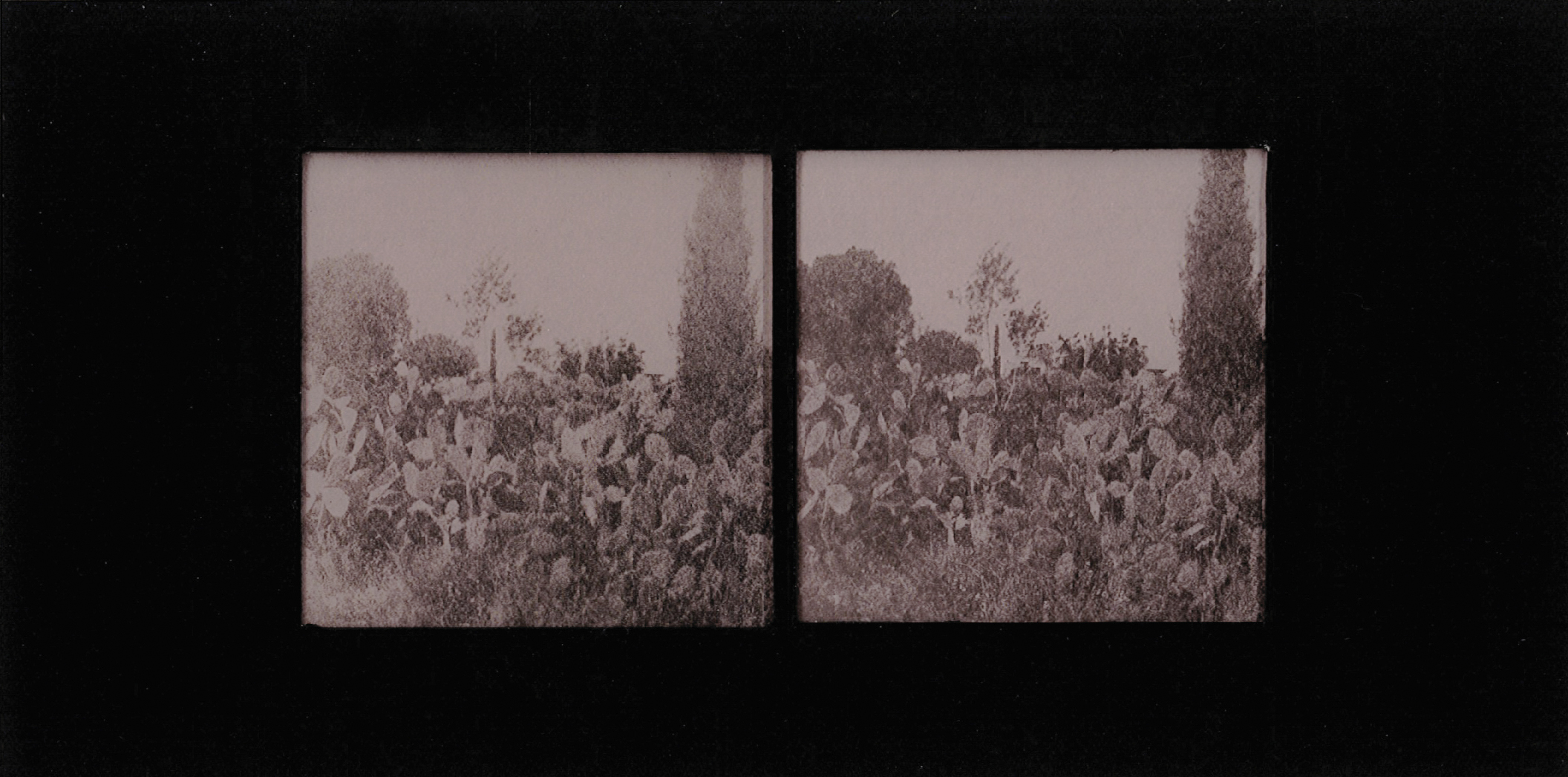 Many of the photographs in this essay were produced during our fieldwork in Palestine in 2023. They depict intimate encounters with cacti across sites of villages destroyed and depopulated in 1948 to contemporary farms and urban spaces in the West Bank. Printed with cochineal that populates these sites, these stereoscopes reference a nineteenth-century image-making technique that creates a three-dimensional effect when looking through the stereoscopic viewfinder. By placing two skewed images of the same scene side by side, the brain fuses the images together, creating a sense of depth and distance, tricking the viewer into an illusion of reality.11