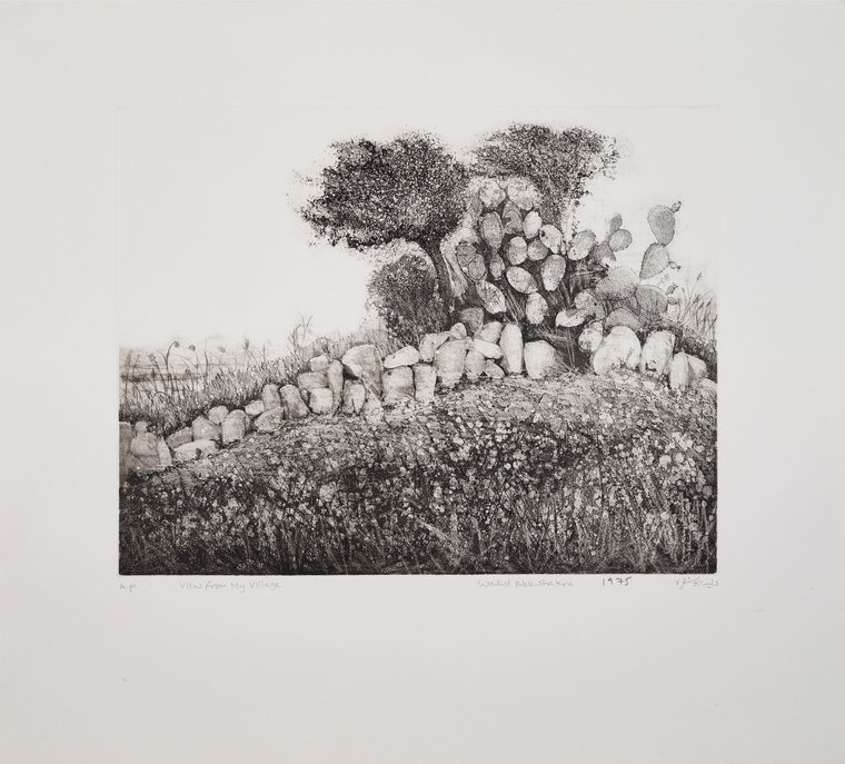 Palestinian artists from across historic Palestine incorporate the cactus into their work as a symbol of rootedness and resistance under a settler-colonial regime. Western landscape aesthetics—such as those applied in the stereoscopes—often create distance between the viewer and the land and separate foreground from background; artists Walid Abu Shaqra and Asim Abu Shaqra break this convention. Walid’s work treats every element of the landscape, whether tree, stone, or cactus hedge, with equal significance, each symbolizing the enduring presence of the uprooted Palestinian people. Asim’s art takes this further, portraying the cactus as a metaphor for displacement. His recurring depiction of a potted cactus—uprooted from its natural habitat and confined to an urban setting—parallels the Palestinian experience of dispossession. Just as the cactus hedge signifies the patience of the land waiting for its people, the potted cactus embodies the patience of a people awaiting their return to their lands.32