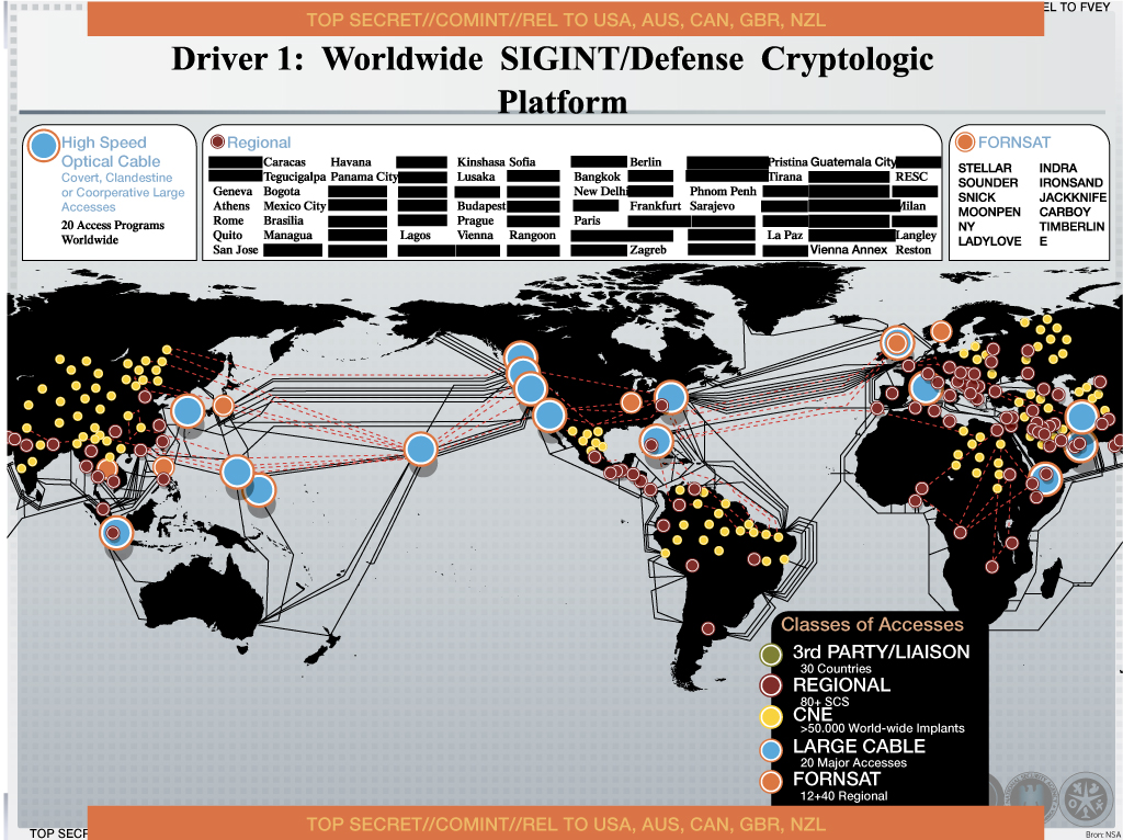 Famously, in 2013, Edward Snowden revealed that the United States had built surveillance systems operating at population scale—collecting communications data from tens of millions domestically and reaching hundreds of millions globally through bulk metadata collection, upstream interception, and platform access. This surveillance was embedded in physical infrastructure. The NSA tapped fiber-optic cables at landing stations on the Atlantic and Pacific coasts, intercepted traffic inside major switching facilities, and accessed data through telecom partners that included AT&T and Verizon. Programs such as FAIRVIEW and STORMBREW captured international communications as they passed through nodes in New York, New Jersey, Virginia, California, and Florida. PRISM provided access to data held by US-based platforms, whose server infrastructure—concentrated in data center regions in Northern Virginia, Oregon, and California—processes communications from users worldwide.