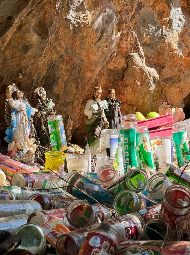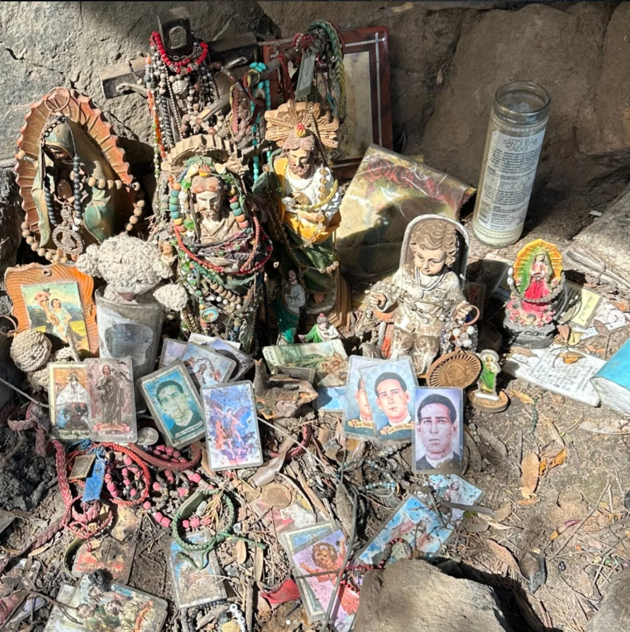 We finished our ride, winding hard and fast down the mountain. The truck whips past blue-tinged vistas of quarry rock and yellow grass so fine it blurs. I spoke to two hikers in the truck, trying to hold my shaky recorder on my knee, scraping their voices, crunchy noise, and other breath in the desert. The mountain is sacred Kumeyaay ancestral territory. One hiker spoke of the lifeworld that had been annihilated from Otay Mountain—by the border wall’s palimpsestic ecocide, and spiritually through the magnitude of migrants’ deaths. The BRC accounts and attends it. They participate in search and rescue operations, place grave markers, and conduct funerals. An unspoken part of the BRC’s mission is death doula work—performing the spiritual and reproductive labor that maintains the dignity of migrants through funeral rites and shrine-making as well as distributing aid for those still alive. Migrating people deserve the cover of noise through the machinations of violence and its blanket of static in the mountain. The BRC performs one last rite. In unison they say the deceased person’s name three times, letting it reverberate through the valleys.