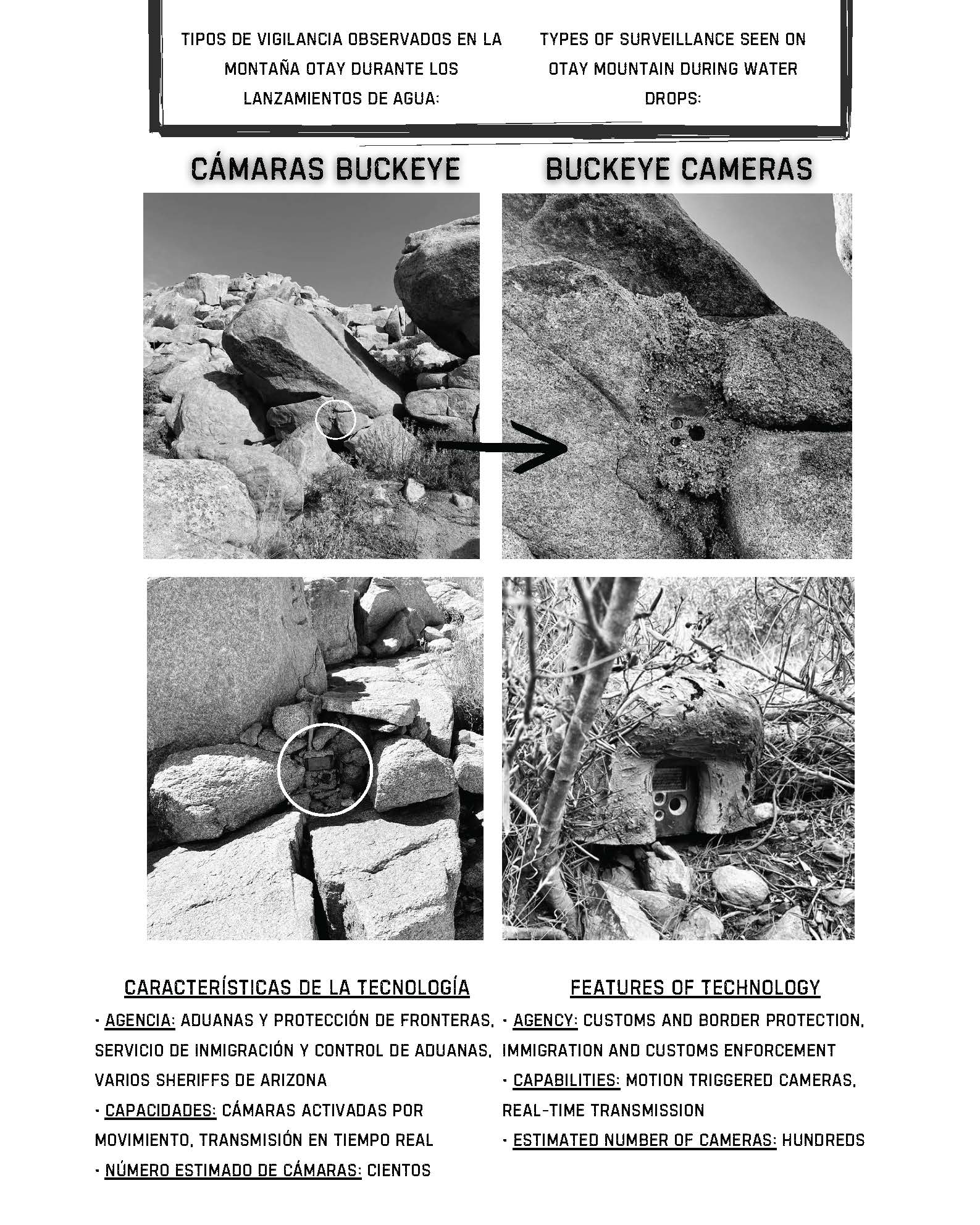 In the back of the BRC truck, one hiker recounted an instance where they found a Buckeye Cam pointed at their piles of water bottles, which were scrawled with encouraging messages, and the acid-colored Gatorades and MREs.22 In recent years, CBP installed cameras at frequent aid drop sites. Buckeye Cams, made by Athens Technical Specialists, are off-grid radio frequency camera systems, often tucked into lucrative government contracts as “networkable trail cameras.” The camera was tucked deep inside the crevices of a fabricated sedentary formation and spackled with soil to disappear into the brush. When the hikers noticed the intrusion, they moved the provisions—but within an hour CBP agents rolled up on the group with threats to arrest them for “tampering with evidence.”23 Aid transfigures into evidence in CBP’s reterritorialization of Otay Mountain.