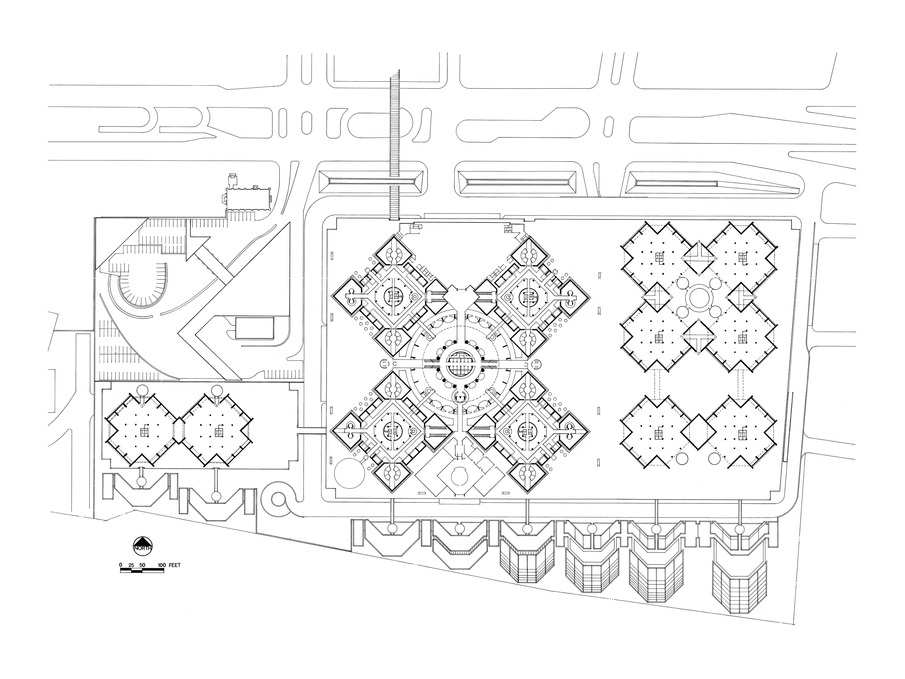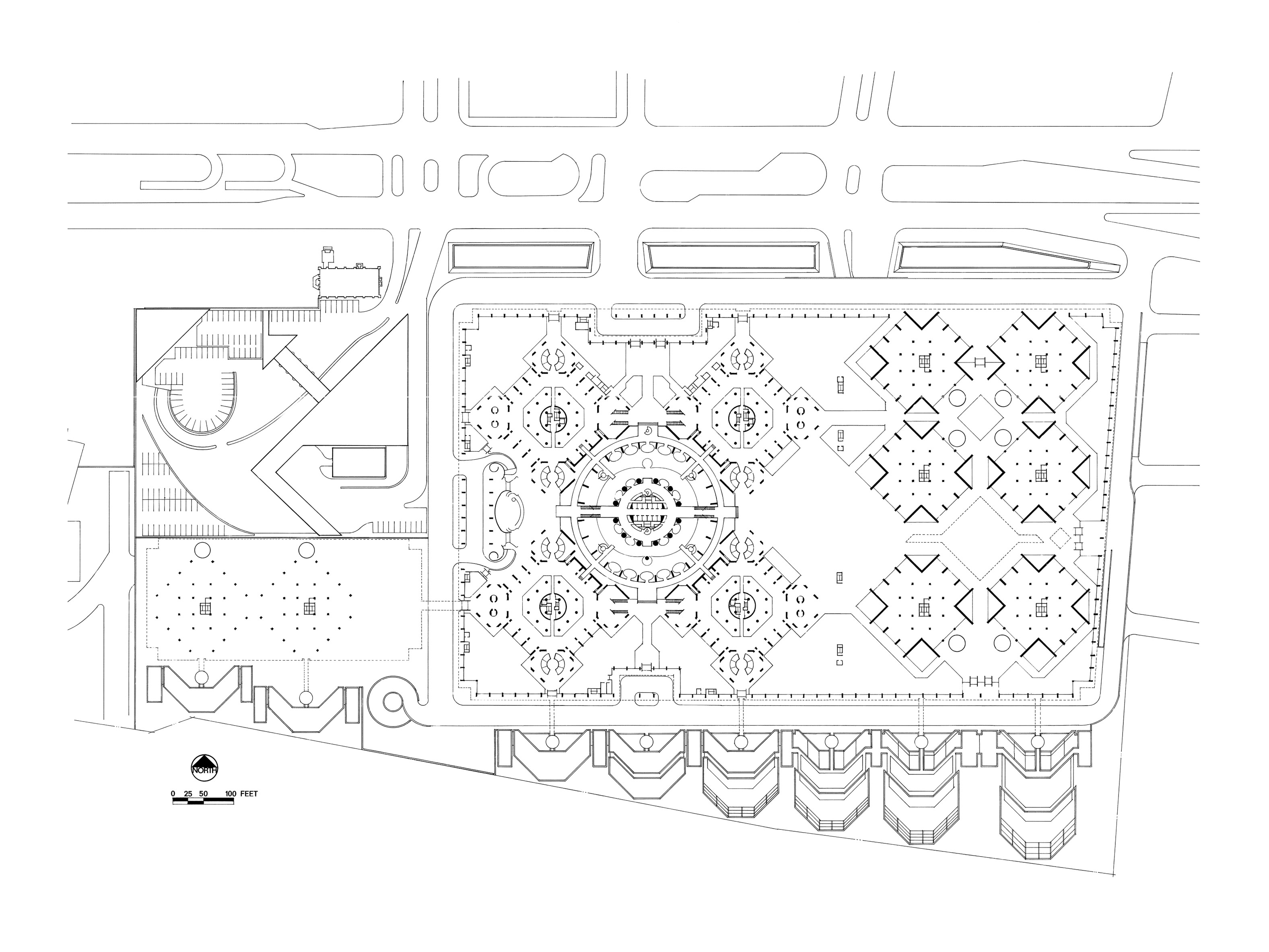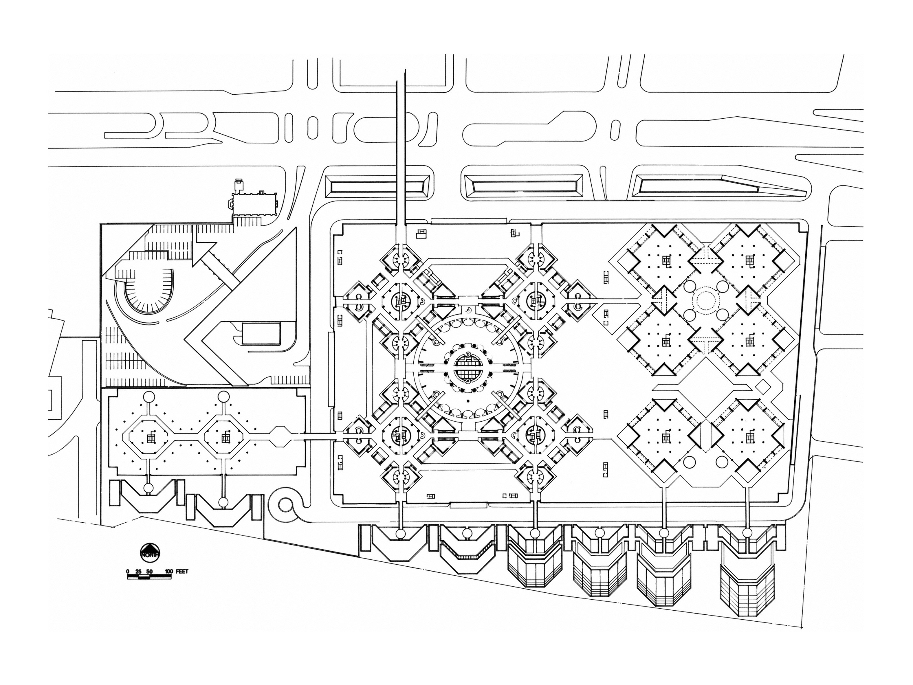 “That is a pretty good example of the atrium typology; appreciation of the project, though, might be a matter of taste.” That was a pretty good-natured assessment of a diagram that I had just drawn, leveled by the instructor of my first-year undergraduate seminar. I had recently visited John Portman’s Hyatt Regency San Francisco and had been struck by the project. When asked to diagram an atrium, I sketched the Hyatt’s skewed pyramidal section, a right triangle roughly parallel with the Embarcadero. Little lozenges with attendant arrows, representing glass elevators, completed the diagram. Given the instructor’s comment, I made a note that Portman’s work might not be something to emulate. I forgot about John Portman for several years.