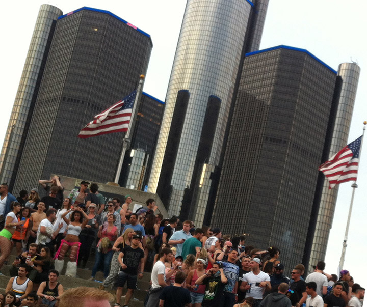 Memorial Day weekend, I’m back at the Renaissance Center. I’ve stayed at the Marriott here three times before. As a graduate student in Ann Arbor, newly reacquainted with Portman’s work, my wife and I made an annual pilgrimage to the RenCen. We’d stay inside the building for a weekend, drinking at its bars, shopping at its stores, walking its rings. After graduating and moving to Chicago, I made another weekend trip to the RenCen, not once stepping outside, and documented the experience for a thematic journal issue on interior urbanism.13 After repeated visits, the place has not lost any of its hypnotic appeal. But this time I’m not here as an architect. I’m attending a pair of music festivals, both spread across three days in Detroit. One is Movement (formerly Detroit Electronic Music Fest), a celebration of Detroit as the birthplace of techno.14 It takes place across several stages in Hart Plaza, just west of the RenCen. The other is called Trip Metal, a festival of more abstract, improvisational, abrasive strains of electronic music. Both festivals are very loud.
