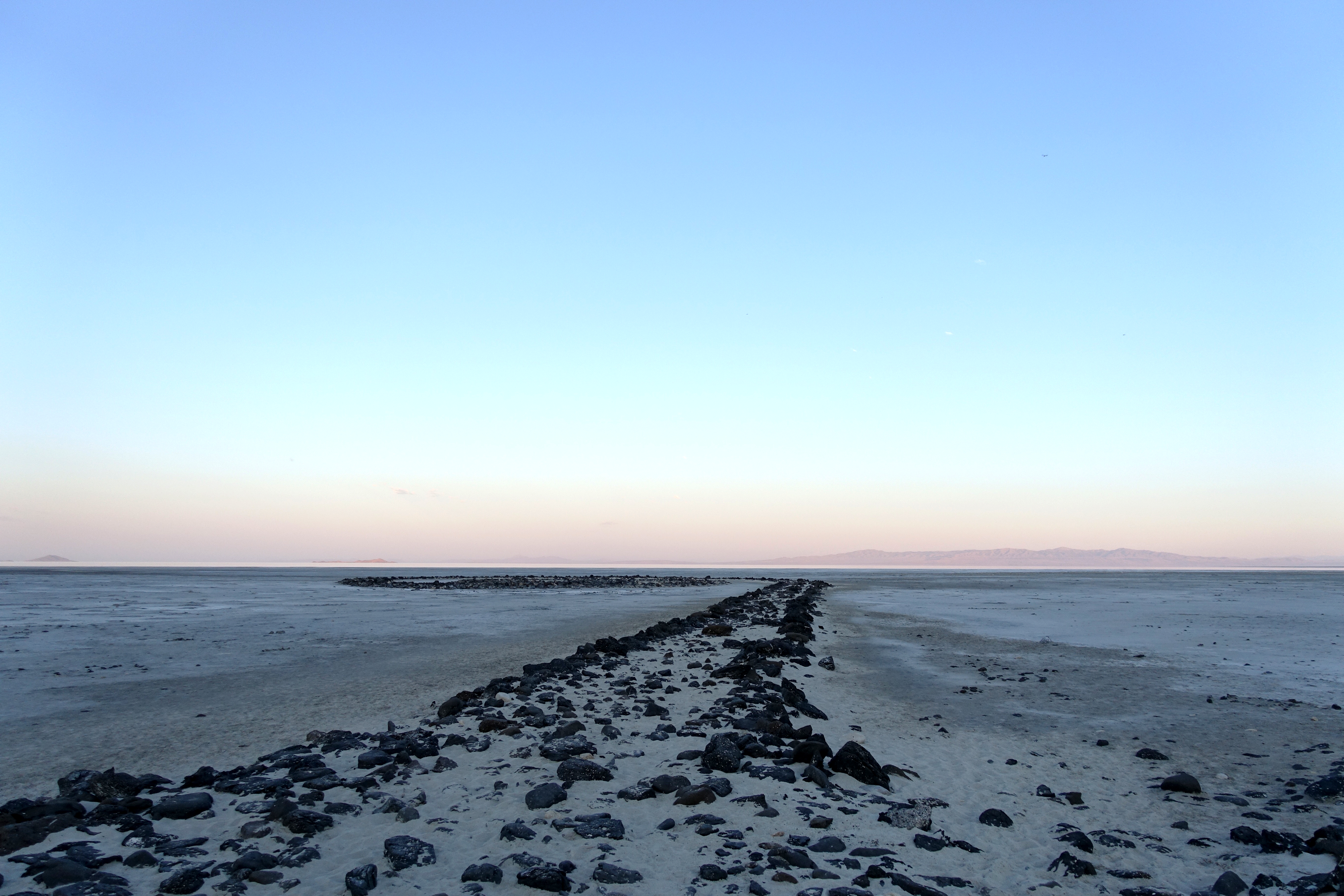 Directions to the Jetty are provided by the Dia Art Foundation website. The foundation acquired the work from Nancy Holt and the estate of Robert Smithson in 1999 and have managed it ever since, including the addition of a small commemorative plaque overlooking the earthwork and the installation of a campground for visitors wishing to stay the night. Dia’s directions are clear enough, and the route is well marked by signs, gently pulling you toward the Spiral as you travel through the desert. Included in the directions are notes about the “LAST GAS STATION” in Corinne Utah, 41 miles to the east, and the “LAST BATHROOMS” and “LAST CELL RECEPTION” at the Golden Spike Historic Site, a small yet well-staffed national monument commemorating the exact location where the east- and west-coast railroad lines were hammered together with a solid gold railroad spike.1